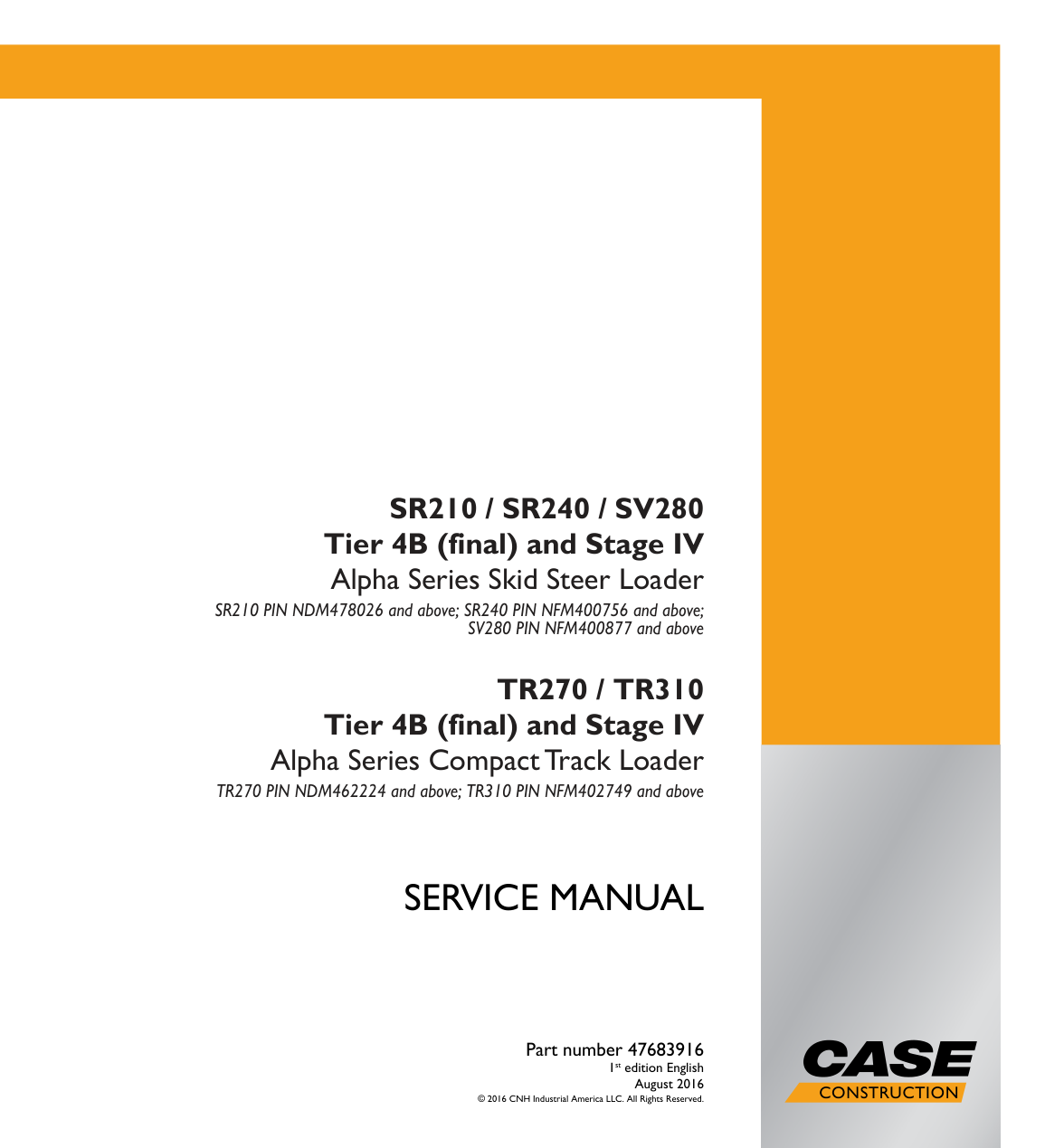 The Case SR210, SR240, and SV280 Tier 4B Skid Steer Loaders are powerful and efficient mid-frame machines engineered to handle demanding construction, agricultural, and material-handling tasks. Built with Tier 4 Final turbocharged diesel engines delivering 74 gross horsepower (68 net hp), these loaders combine reliable performance with emissions compliance and fuel efficiency. With rated operating capacities ranging from 2,100 lbs on the SR210 up to 2,800 lbs on the SV280, this series offers excellent lifting strength and breakout force for a wide range of attachments and applications.