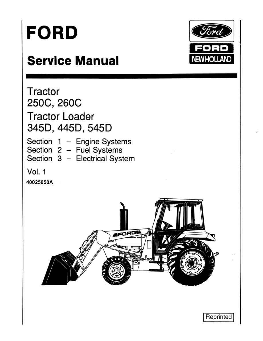 The Ford 250C, 260C, 345D, 445D, and 545D tractors are durable industrial-grade machines designed for heavy-duty agricultural, municipal, and construction tasks. Built in the late 1980s and early 1990s, this series is powered by reliable Ford 3-cylinder diesel engines, ranging from 52 hp (250C/260C) to approximately 66 hp (545D). With robust drivetrains, open-center hydraulic systems, and strong rear lift capacities, these tractors deliver consistent performance across loader work, mowing, hauling, and implement operation. Their rugged frames, differential lock, wet-disc brakes, and optional 2WD/4WD configurations make them versatile workhorses in demanding environments.