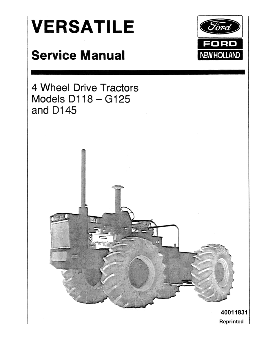 The Ford Versatile D118, D145, and G125 tractors were among the first generation of Versatile 4WD articulated tractors, produced in the late 1960s and early 1970s. These models featured robust Cummins and Ford engines ranging from 135 hp in the D118 to 180 hp in the D145, with the G125 powered by a 165 hp Ford V-8 gasoline engine. Built for durability and versatility, these tractors introduced farmers to high-horsepower 4WD machines capable of handling heavy tillage and demanding fieldwork with ease.