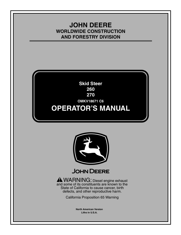John Deere 260, 270 Skid Steers Operator’s Manuals (OMKV18671)