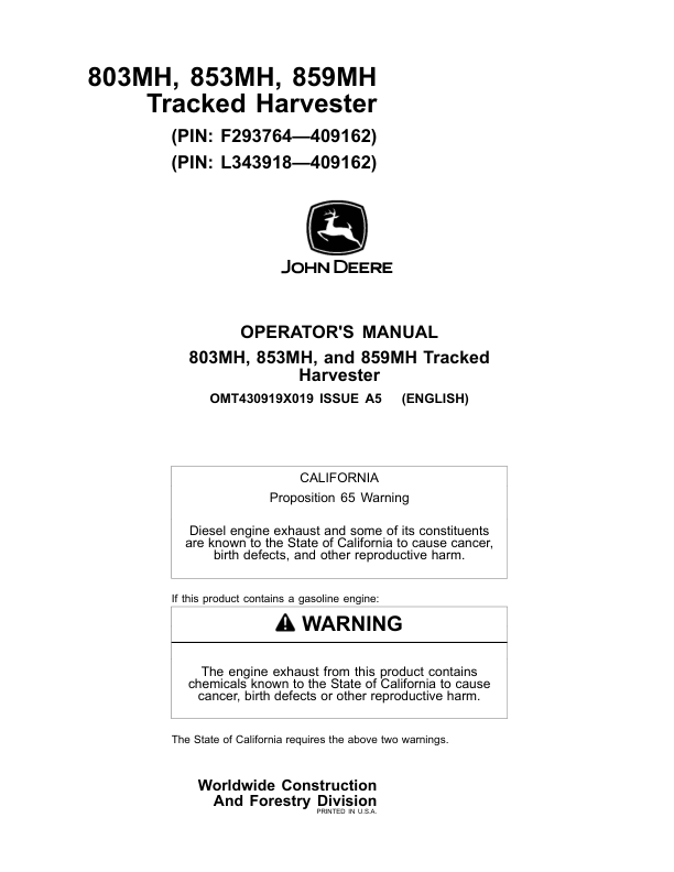 John Deere 803MH, 853MH, 859MH Tracked Harvesters Operator’s Manuals (OMT430919X019)