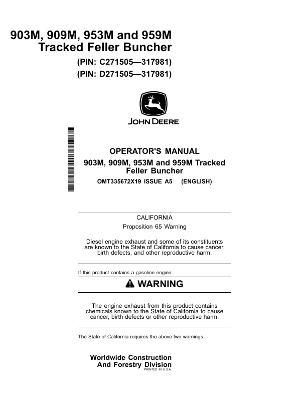 John Deere 903M, 909M, 953M, 959M Tracked Feller Bunchers Operator’s Manuals (OMT335672X19)