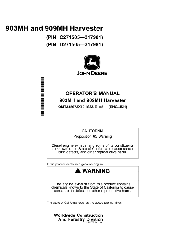 John Deere 903MH, 909MH Tracked Harvesters Operator’s Manuals (OMT335673X19)