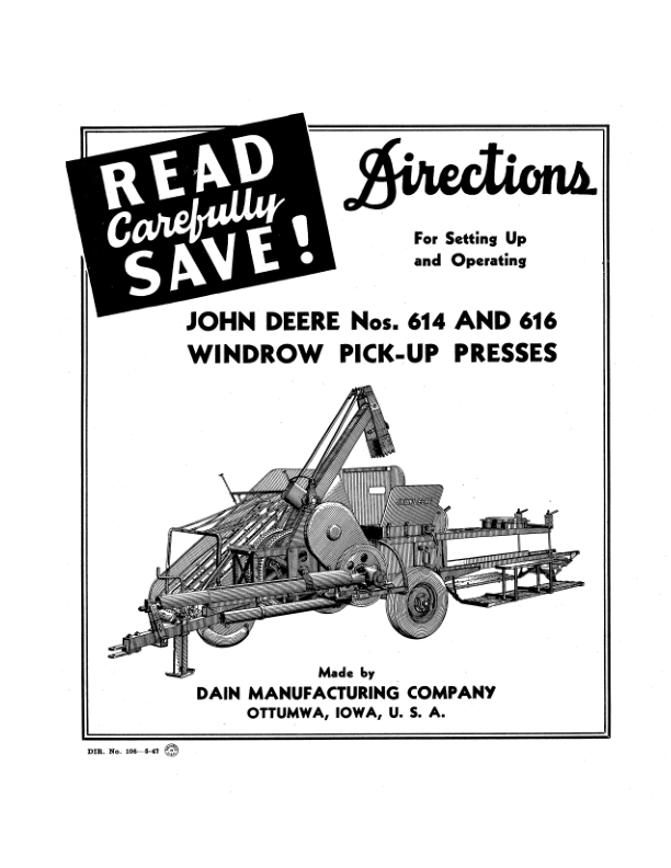 John Deere Nos. 614, 616 Windrow Pick-up Presses Operator’s Manual (DIR106A)