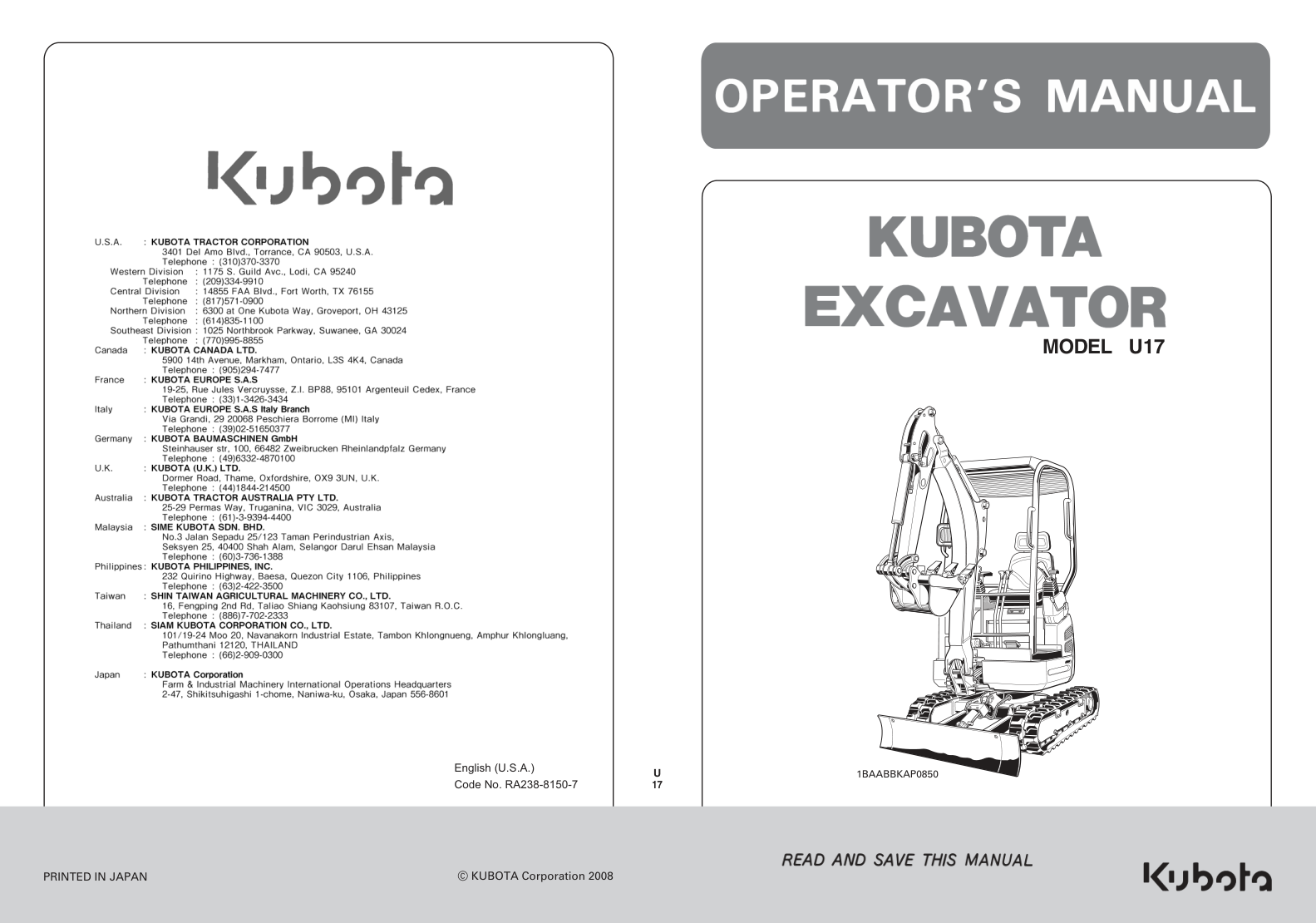The U17 is powered by a Kubota diesel engine rated at approximately 17 hp, achieving a digging depth of 2.31 m and a bucket breakout force of around 1,550 kgf. Its adjustable track width (from 990 mm to 1,240 mm) allows access through narrow passageways while maintaining stability during excavation. The U17-3, an updated model, builds on the same compact platform with improvements in hydraulic efficiency, ergonomics, and safety features. Both machines feature zero-tail swing for safe operation in confined spaces, smooth travel motors, and responsive auxiliary hydraulics for attachment versatility.
